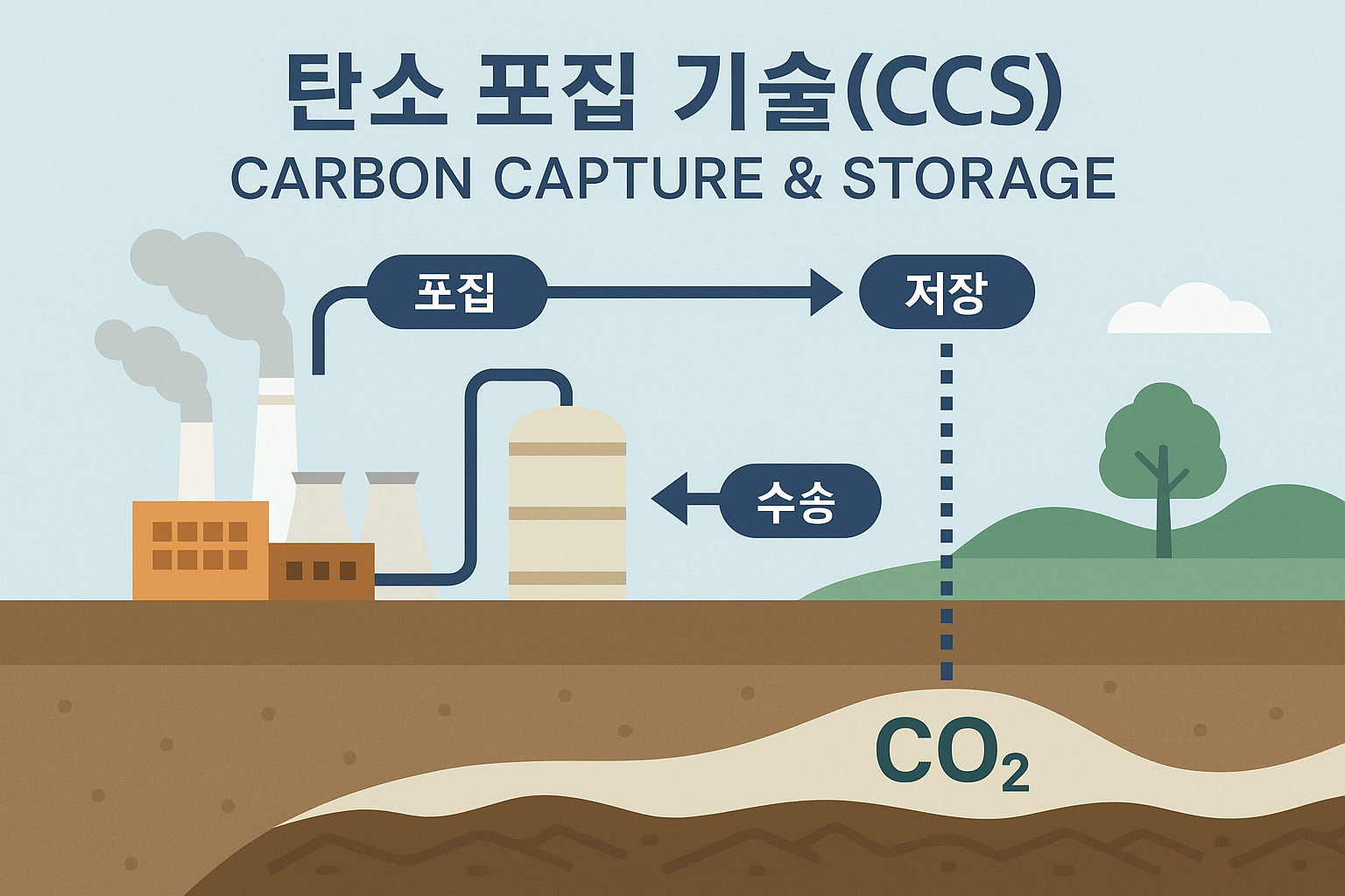 탄소 포집 및 저장(Carbon Capture and Storage, CCS)은 대기 중으로 배출되기 전의 이산화탄소(CO₂)를 포집하여 지하 깊숙한 곳에 안전하게 저장하는 기술입니다. 주로 발전소, 제철소, 시멘트 공장 등 대량의 이산화탄소를 배출하는 산업 현장에서 활용됩니다.